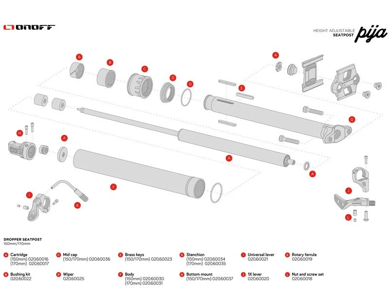 La cartouche hydraulique OnOff pour tige de selle télescopique Pija est disponible en plusieurs versions en fonction de votre débattement (100, 125, 150 ou 170 mm).