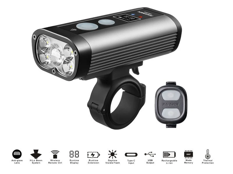 Doté de 5 LED blanches haute intensité et d’une batterie rechargeable haute capacité de 8 000 mAh/3,6 V, la lampe Ravemen PR2400 est un éclairage de vélo hautes performances conçu pour les cyclistes qui aiment la nuit, en particulier les randonnées nocturnes. Avec une sortie maximale de 2400 lumens et des fonctionnalités conviviales, comme l’affichage de l’autonomie OLED et la télécommande sans fil, la PR2400 fera passer vos sorties nocturne à un tout autre niveau et vous permettra de profiter du frisson du full speed dans le noir complet comme jamais auparavant !