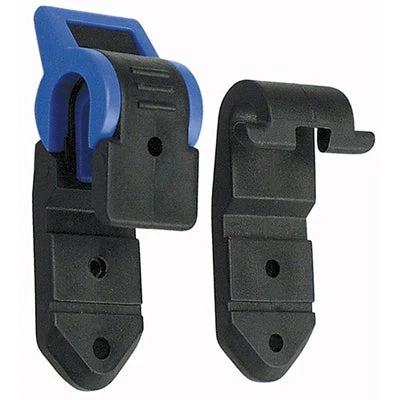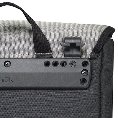 La sacoche est renforcée par une mousse souple. Elle est équipée de crochets pour la fixation KLICKfix pour porte bagage (crochets noirs sur la photo 6) ainsi que des crochets supplémentaires pour porte-bagages vélo classiques 6-12 mm (crochets bleus sur la photo 6). Le crochet inférieur de la sacoche est disponible comme pièce détachée en cas de casse ou de perte.